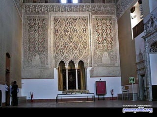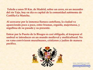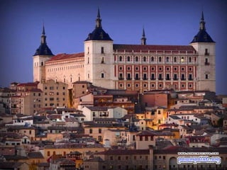 Toledo es una ciudad española conocida por la convivencia pacífica entre cristianos, musulmanes y judíos durante la Edad Media, lo que se refleja en su arquitectura mudéjar. La ciudad alberga importantes monumentos como la catedral primada, el Alcázar y sinagogas que recuerdan esa época de diversidad cultural. Toledo también es famosa por su artesanía del acero y el damasquinado, técnicas usadas originalmente para decorar espadas.