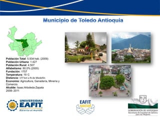 Toledo, Antioquia, tiene una población total de 5,934 habitantes, con un 80% de alfabetismo. La economía se basa en la agricultura, ganadería, minería y comercio. La Asociación Municipal de Mujeres de Toledo, activa desde 1999, lidera varias unidades productivas, incluyendo panadería y procesadora de frutas.