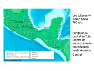 Los toltecas fueron una civilización mesoamericana que dominó el centro de México entre los años 900 y 1200 d.C., según se muestra en la línea de tiempo, estableciendo su capital en Tula antes de la llegada de los europeos en 1532.