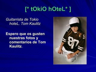 Tom Kaulitz es el guitarrista de la banda alemana Tokio Hotel. Nació el 1 de septiembre, mide 1.80 metros y tiene un piercing en el labio izquierdo. Algunos premios que ha recibido la banda son el Premio Rockbjörnen en 2008 al mejor grupo internacional del año y el Premio Echo Awards en 2008 al mejor video nacional.
