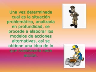 El documento describe el proceso de toma de decisiones, incluyendo definir el problema, generar opciones, evaluarlas y seleccionar una. Explica que la toma de decisiones involucra identificar una situación problemática, analizarla y generar acciones alternativas para resolverla. También cubre etapas como diagnóstico, investigación, desarrollo de alternativas y ejecución del plan seleccionado.