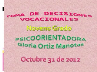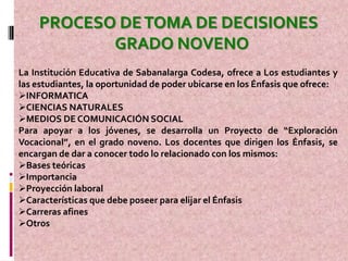 El documento describe el proceso de orientación vocacional que ofrece la Institución Educativa de Sabanalarga Codesa para los estudiantes de noveno grado. La escuela ofrece tres énfasis principales y utiliza un proyecto de exploración vocacional para ayudar a los estudiantes a elegir el énfasis que mejor se adapte a sus aptitudes. Los docentes presentan información sobre cada énfasis mientras que el departamento de psicoorientación ofrece charlas y talleres para guiar a los estudiantes en el proceso de toma de decisiones y elegir su futuro cam