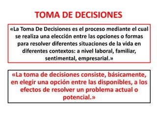 El documento habla sobre la toma de decisiones. Explica que la toma de decisiones implica elegir entre opciones para resolver situaciones en diferentes contextos como el laboral o familiar. Luego clasifica las decisiones en programadas, que son repetitivas y se toman según procedimientos, y no programadas, que se toman ante problemas poco frecuentes. Finalmente, menciona que las decisiones se pueden tomar en contextos de certeza o incertidumbre, dependiendo de la información disponible y las probabilidades conocidas de los resultados.