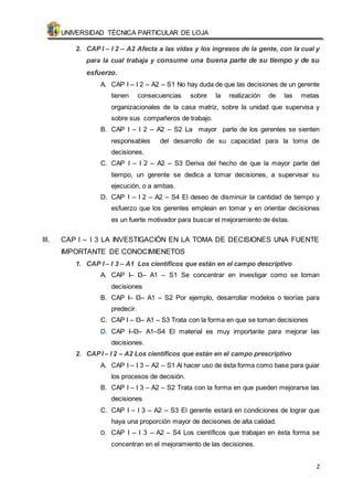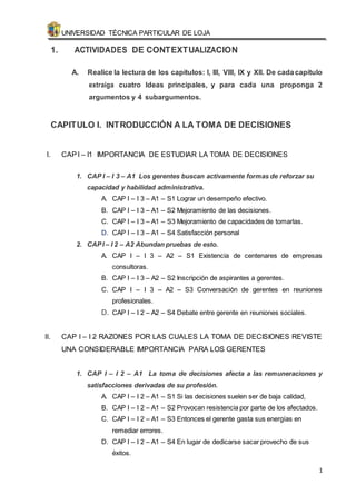 Este documento resume los puntos principales de varios capítulos de un libro sobre toma de decisiones. Resume las ideas clave de cada capítulo en 4 subargumentos. El Capítulo I introduce el tema y su importancia. El Capítulo III discute los límites de la racionalidad individual y cómo afectan la toma de decisiones. El Capítulo VIII explica cómo los grupos pueden ayudar a superar los recursos limitados de una persona al tomar decisiones, aunque también pueden consumir más tiempo.