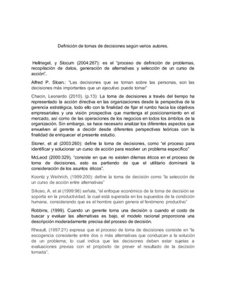 Este documento define el concepto de toma de decisiones según varios autores y describe el proceso de toma de decisiones. Define la toma de decisiones como el proceso de identificar y resolver un curso de acción para un problema específico. También distingue entre decisiones estructuradas y no estructuradas dependiendo de si el problema es recurrente o no. Finalmente, presenta algunas estrategias y técnicas para la toma de decisiones como simulaciones, el método de caso y el autoaprendizaje.
