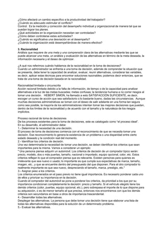 Este documento trata sobre el proceso de toma de decisiones. Explica que la toma de decisiones es fundamental en la administración de organizaciones y que involucra etapas como identificar el problema, generar alternativas, evaluarlas y seleccionar la mejor opción. También describe diferentes enfoques de toma de decisiones como los procesos racional y creativo, así como técnicas para fomentar la creatividad como la lluvia de ideas y la sinéctica.