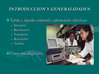 El documento habla sobre la importancia de la toma, transporte y análisis de muestras para el diagnóstico microbiológico. Se debe seleccionar la muestra apropiada del lugar de infección, en el momento oportuno y en la cantidad adecuada. Es necesario el uso de técnicas asépticas, rotular correctamente la muestra e identificar al paciente, y transportar y conservar la muestra de forma que permita la supervivencia de los posibles organismos, para evitar errores en el diagnóstico.