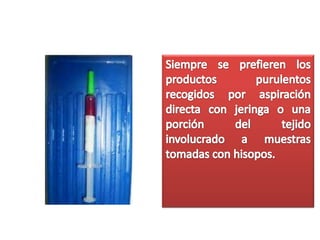 Este documento proporciona instrucciones para la correcta toma y transporte de muestras para microbiología. Explica que las muestras deben ser tomadas del sitio real de infección, en cantidad suficiente, y usando recipientes estériles rotulados. Además, las muestras deben ser transportadas al laboratorio dentro de las 2 horas siguientes a la toma para mantenerlas lo más próximas a su estado original y evitar la contaminación. Finalmente, identifica algunos tipos de muestras que no son aceptables para análisis.