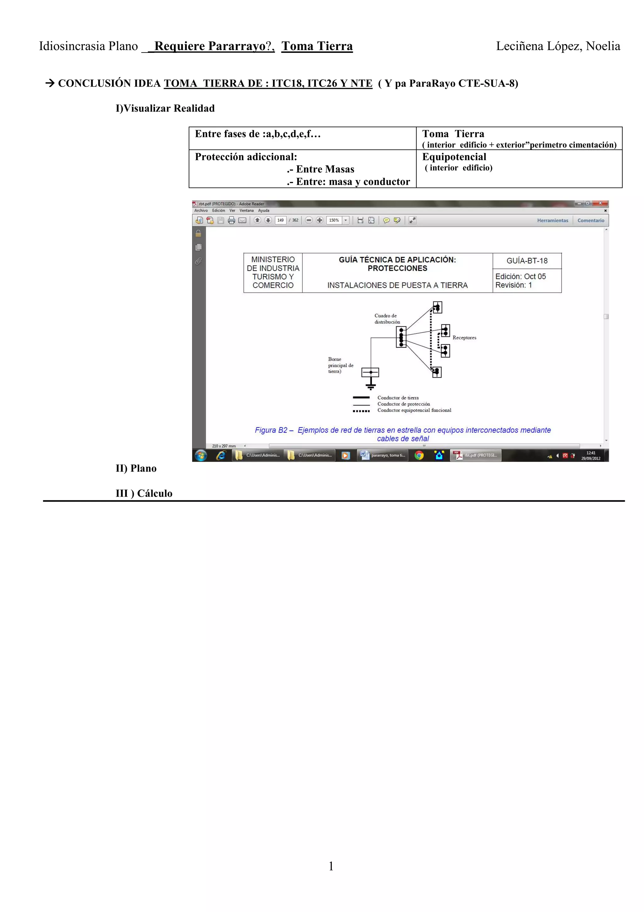 El documento analiza la necesidad de instalar un pararrayo y la toma de tierra en edificaciones según normativas específicas, destacando la importancia de la resistividad del terreno y el diseño adecuado de las conexiones. Se describen criterios para conectar diversas instalaciones a la puesta a tierra y se establecen directrices sobre la aplicación de conductores enterrados y la resistencia eléctrica. Además, se proporciona un ejemplo de cálculo para determinar la eficacia de la protección contra rayos y la configuración necesaria para cumplir con los estándares establecidos.
