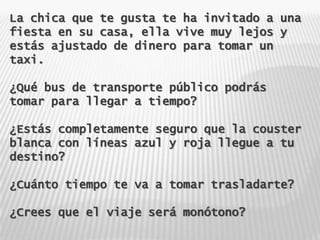 El documento presenta Tomabus.pe, una plataforma de gestión del transporte público que permite a los usuarios planificar sus viajes de manera eficiente. La plataforma brinda información sobre qué rutas de bus tomar para llegar a destinos específicos, los tiempos de viaje estimados y garantiza que el usuario llegue a su destino de forma segura. El documento recomienda usar Tomabus.pe en lugar de tomar buses al azar o gastar dinero en un taxi.