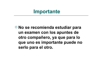 Tomar buenos apuntes requiere desarrollar la habilidad auditiva para captar la información clave de forma concisa y organizada, sin copiar los apuntes de otros estudiantes. Los apuntes deben ser claros, concretos y fieles al contenido, usando un lenguaje preciso, breve y propio, y estar bien presentados de manera legible y organizada. Existen diferentes tipos de apuntes como impresos, copiados o tomados en clase para el estudio.