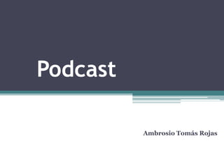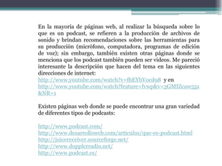 Este documento describe los podcasts y sus aplicaciones educativas potenciales. Explica que un podcast puede ser de audio o video y proporciona algunos sitios web con podcasts. También detalla cuatro formas en que un profesor podría usar podcasts en su enseñanza: grabar clases, procedimientos de laboratorio, comentarios de lectura de estudiantes, y presentaciones de proyectos de estudiantes. Finalmente, plantea algunas preguntas sin responder sobre los impactos comparativos de podcasts y videopodcasts, los recursos necesarios para crear un videop