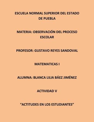 Este documento describe varias actitudes comunes que los estudiantes muestran durante las clases, como juego, desinterés y bromas. Explica que la comunicación entre maestros y estudiantes a menudo es escasa, y que las actitudes de los estudiantes reflejan la actitud del maestro. Describe cómo los estudiantes en una escuela en particular parecían más interesados en las clases donde los maestros tenían una relación más amigable y los hacían sentir cómodos participando. Concluye que el interés y amor de los maestros por su
