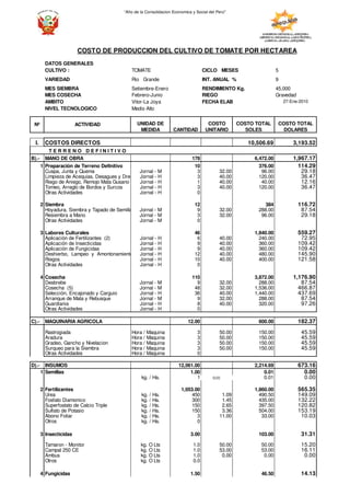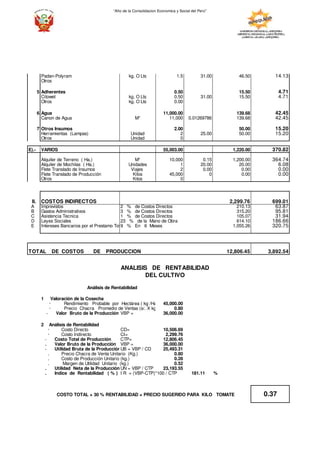 Este documento presenta un resumen del costo de producción por hectárea del cultivo de tomate en la zona de Vitor-La Joya en Perú. Detalla los costos directos e indirectos involucrados, incluyendo mano de obra, maquinaria, insumos, alquiler de tierra, y otros gastos. El costo total de producción asciende a aproximadamente 10,506 soles (3,193 dólares estadounidenses) por hectárea cultivada, con costos directos representando alrededor del 80% del total y los costos indirect