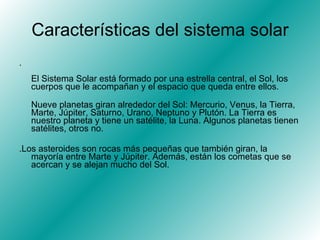 El documento resume las características del Sistema Solar, incluyendo que está formado por el Sol y nueve planetas que giran a su alrededor, con la Tierra teniendo un satélite llamado la Luna. También describe los asteroides y cometas que orbitan en el Sistema Solar, así como el tamaño y composición del Universo y que contiene galaxias, cúmulos de galaxias y estructuras mayores. Finalmente, explica que las estrellas son masas de gases luminosos a altas temperaturas que emiten luz a través