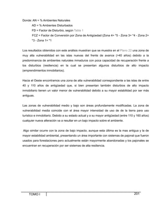 El documento analiza los niveles de vulnerabilidad y consolidación del medio natural y antropizado en las islas de la Primera Sección del Delta Bonaerense. Describe tres zonas de vulnerabilidad del medio natural - muy alta, alta y media/baja - basadas en factores como la antigüedad, disturbios e integridad ecológica de las islas. Asimismo, detalla tres sectores en las islas - agrícola-forestal, residencial y nuevo frente isleño - que difieren en usos del suelo, accesibilidad, desar