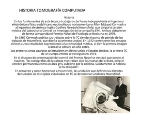 La tomografía computada fue desarrollada de forma independiente por Allan Cormack y Godfrey Hounsfield en los años 1960 y 1970, recibiendo ambos el Premio Nobel de Fisiología o Medicina en 1979. Los primeros escáneres permitieron ver imágenes del cerebro con mayor detalle que las radiografías previas. Las unidades que miden la densidad de los tejidos en una tomografía computada se denominan unidades Hounsfield en honor a uno de sus pioneros.
