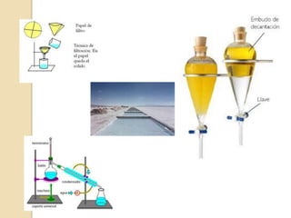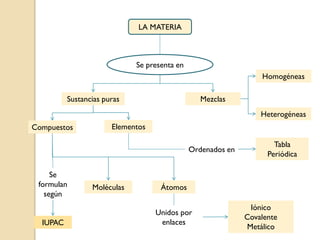 Este documento trata sobre la estructura de la materia a nivel atómico y molecular. Explica que la materia se presenta en sustancias puras y mezclas, y que las sustancias puras pueden ser elementos o compuestos. Describe la estructura del átomo, incluyendo el núcleo, electrones y números atómico y másico. También explica los diferentes tipos de enlace químico - iónico, covalente y metálico - y cómo determinan las propiedades de los compuestos.