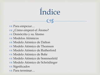 El documento describe la evolución de los modelos atómicos a través de la historia, comenzando con la idea de átomo propuesta por Demócrito en la antigüedad. Luego presenta los modelos de Dalton, Thomson, Rutherford, Bohr, Sommerfeld y Schrödinger, los cuales fueron mejorando la comprensión de la estructura atómica a través de nuevos descubrimientos experimentales. Cada modelo introdujo conceptos como el electrón, el núcleo atómico y los niveles cuánticos de energía, ac