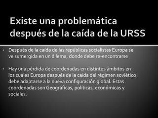 La caída de la Unión Soviética generó un dilema en Europa sobre su identidad. Se produjo una pérdida de coordenadas geográficas, políticas, económicas y sociales. Esto llevó a una polarización entre el este y el oeste, donde el modelo occidental se impuso como el óptimo. El caso de Alemania muestra esta división, con mayores niveles de desempleo en el este. El inglés también pasó a ser el idioma predominante, dejando de lado otros idiomas europeos.