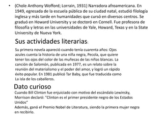 Este documento resume la vida y carrera de la escritora afroamericana Toni Morrison. Después de graduarse de la universidad, Morrison trabajó como profesora en varias universidades. Publicó su primera novela a los 40 años de edad y luego escribió otras novelas aclamadas como La canción de Salomón y Amada. Morrison fue la primera mujer negra en ganar el Premio Nobel de Literatura en 1993 en reconocimiento a su notable contribución a la literatura.