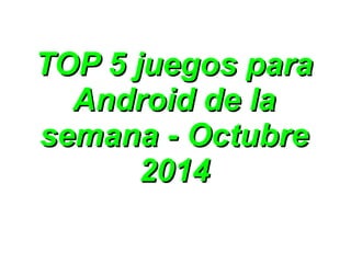 Este documento presenta cinco juegos para Android de la semana del 14 de octubre de 2014. Incluye FIFA 15 Ultimate Team, un juego de fútbol con más de 10,000 jugadores y 500 equipos reales; Kill Shot, un juego de disparos en primera persona con más de 160 misiones y 12 mapas; Just Dance Now, un juego de baile basado en la franquicia Just Dance con más de 50 canciones gratis; y Huerons, un rompecabezas adictivo donde el objetivo es unir círculos de colores hasta dejar uno solo en el