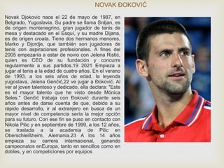 El documento presenta información biográfica y resultados de cinco tenistas profesionales: Novak Djokovic, Rafa Nadal, Roger Federer, Stanislas Wawrinka y David Ferrer. Se detalla el lugar y fecha de nacimiento de cada jugador, así como algunos de sus primeros títulos y logros importantes en su carrera. Las fuentes de información son las páginas de Wikipedia en español de cada tenista.