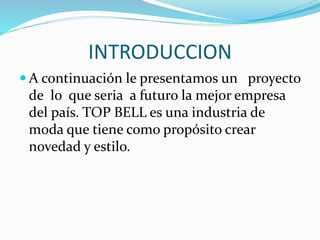 El documento presenta un proyecto para la empresa TOP BELL, una industria de moda con el objetivo de crear novedad y estilo. Su misión es diseñar e innovar moda para satisfacer los gustos de los clientes. Su visión es establecerse nacionalmente como una de las mejores exportaciones textiles para el 2012. Sus objetivos incluyen crear una empresa de confecciones, obtener maquinaria y materiales, y emplear gente calificada. La empresa busca brindar productos de calidad diseñados por expertos para satisfacer a los clientes
