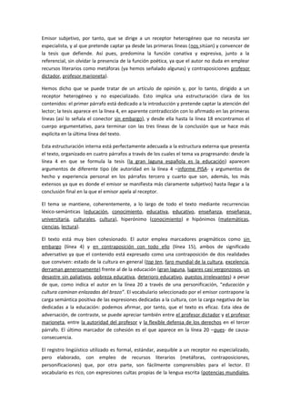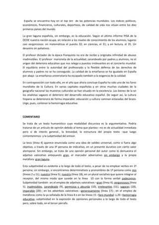 El documento analiza el estado de la educación en España. Aunque España se encuentra entre los diez mejores países en varios índices, su educación es deficiente según informes internacionales. La educación española ha pasado de un modelo autoritario a uno permisivo que ha reducido la calidad. Para mejorar, España debe solucionar la "hemorragia educativa" y equilibrar la autoridad de los profesores con los derechos de los estudiantes.