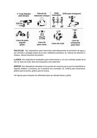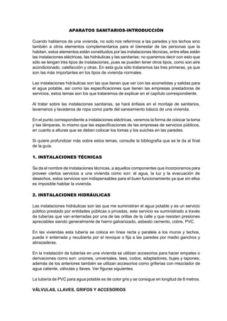Este documento trata sobre las instalaciones técnicas básicas en una vivienda, incluyendo las instalaciones hidráulicas, sanitarias y eléctricas. Explica que las instalaciones hidráulicas suministran el agua potable a través de tuberías, mientras que las instalaciones sanitarias se encargan de la evacuación de aguas servidas. Luego entra en detalle sobre cómo instalar la red interior de agua, incluyendo la colocación de tuberías, válvulas, grif