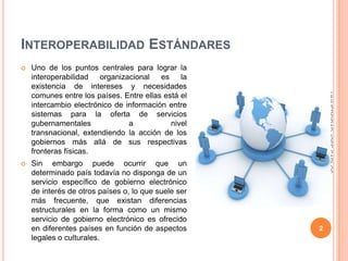 El documento habla sobre la interoperabilidad entre sistemas a través del uso de estándares, la exposición y consumo de servicios, y la mensajería. Aborda los retos de la interoperabilidad semántica como las diferencias en los metadatos y conceptos entre países. Propone una arquitectura que permita el intercambio de información entre entidades a través de una pasarela de servicios compuestos siguiendo estándares.
