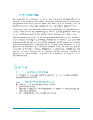 El documento presenta un informe sobre la nivelación topográfica y su aplicación en el desarrollo de obras civiles, destacando su importancia histórica y técnica. Se describen los objetivos del trabajo de nivelación de la avenida Mundial, los instrumentos utilizados, y se detallan los procedimientos para realizar mediciones precisas. Además, incluye un marco teórico sobre los métodos de nivelación, altimetría y cálculos de elevación, así como los resultados obtenidos de una práctica de campo.