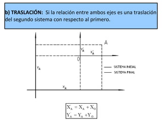 Este documento describe los tipos de ángulos utilizados en topografía, incluyendo ángulos horizontales y verticales. También explica los sistemas de coordenadas cartesiano y polar, y cómo convertir entre ellos. Finalmente, cubre los cambios entre sistemas de coordenadas, como giros, traslaciones y transformaciones Helmert bidimensionales.