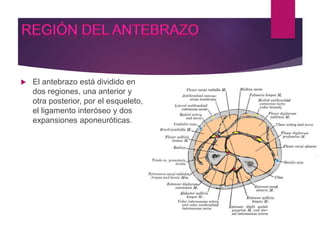 Este documento resume la anatomía topográfica de la región del antebrazo, muñeca y mano. Describe las divisiones anatómicas de estas regiones, la musculatura, vasos, nervios e inervación de cada músculo. También explica las articulaciones de la muñeca, entre los huesos del carpo y entre los metacarpianos y falanges. Finalmente, menciona algunas patologías y lesiones comunes como el síndrome del túnel carpiano, dedo en gatillo, tendinitis y fracturas.