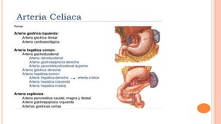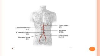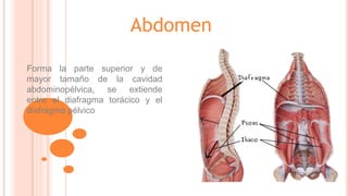 La cavidad abdominal se divide en cuatro cuadrantes para fines clínicos. Cada cuadrante contiene órganos específicos. La pared abdominal también se divide en regiones anatómicas definidas por líneas horizontales y verticales. El peritoneo reviste la cavidad abdominal y sus órganos. El conducto inguinal contiene estructuras que pasan de la cavidad abdominal a la ingle. Las hernias inguinales pueden ser directas o indirectas y requieren cirugía para repararlas de manera permanente.