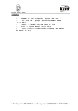Este documento presenta el programa de la asignatura de Topología General. Incluye 7 temas principales: 1) Conjuntos y funciones, 2) Espacios métricos, 3) Espacios topológicos, 4) Bases y espacios producto/cociente, 5) Separación, 6) Espacios compactos, y 7) Espacios conexos. También lista 4 libros de referencia sobre topología.