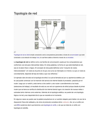 La topología de red descrita es una topología en árbol, donde varios computadores personales están conectados a través de un conmutador a una estación de trabajo Unix conectada a Internet a través de un enrutador. La topología de red se define como la forma en que los nodos de una red están interconectados para compartir datos, ya sea físicamente o lógicamente. Un ejemplo común es una topología de árbol que se ramifica desde el proveedor de Internet hasta los hosts a través de routers y switches, dando una apariencia de