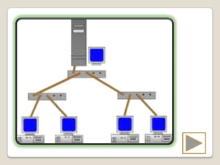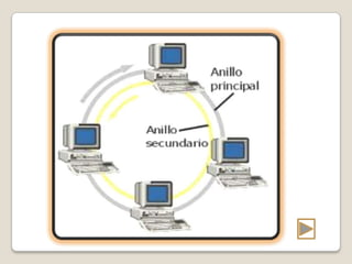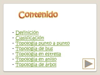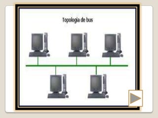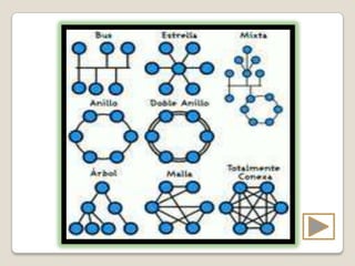 Este documento describe diferentes tipos de topologías de red, incluyendo punto a punto, bus, estrella, anillo y árbol. Explica brevemente cada una de estas topologías, describiendo cómo se conectan y comunican los dispositivos en cada configuración.