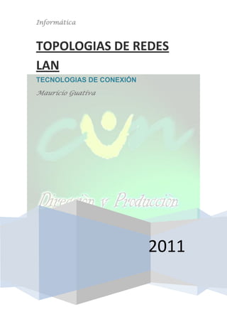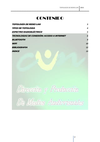 Este documento describe diferentes tipos de topologías de redes LAN y tecnologías de conexión inalámbricas. Explica las topologías en estrella, bus, anillo y híbridas, y discute tecnologías como Bluetooth, WiFi, DSL, cable e Internet satelital. También proporciona detalles sobre el espectro radioeléctrico y velocidades de conexión para diferentes estándares como ADSL, SDSL y líneas T1.