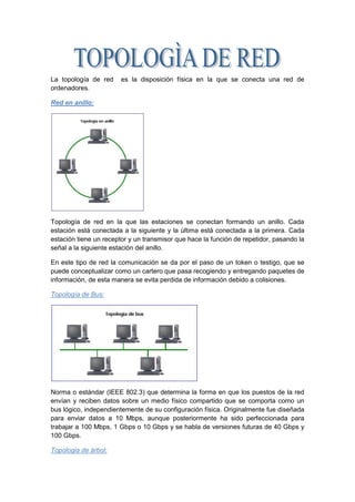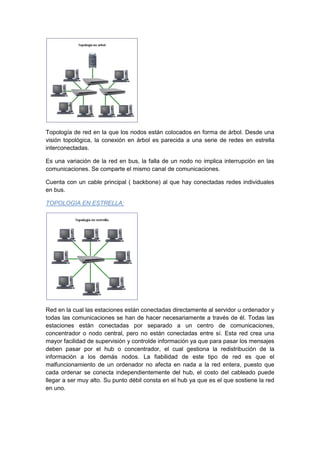 Este documento describe diferentes tipologías de redes, incluyendo red en anillo, bus, árbol, estrella y malla. Una red en anillo conecta estaciones en un círculo donde cada estación actúa como repetidor. Una topología de bus usa un medio compartido donde las estaciones envían y reciben datos. Una red en árbol conecta nodos en forma de árbol de manera similar a redes en estrella interconectadas. Una topología en estrella conecta todas las estaciones a un servidor central. Una red en malla cone