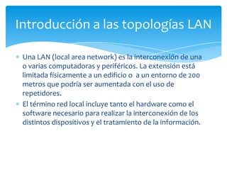 Este documento describe diferentes tipos de topologías LAN. Explica topologías físicas como bus circular, anillo, estrella, jerárquica, malla y árbol. También cubre topologías lógicas como broadcast, donde cada estación envía datos a todas las demás, y transmisión de tokens, donde un token electrónico controla el acceso secuencial a la red.
