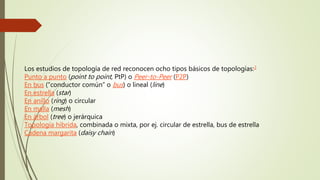 La topología de red se define como la forma en que está diseñada una red, ya sea físicamente o lógicamente. Una red está compuesta de nodos interconectados, donde un nodo puede ser un servidor, terminal, dispositivo de red o punto de intersección de una curva. Existen diferentes tipos de topologías como punto a punto, bus, estrella, anillo, malla, árbol y híbridas. La topología determina solo la configuración de las conexiones entre nodos, no factores como la distancia entre ellos.