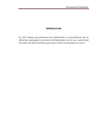 Este documento describe diferentes tipos de topologías de red, incluyendo topologías en anillo, de estrella y de bus. Explica los componentes clave de una red como el hub, switch y router. También analiza las ventajas y desventajas de cada topología. El objetivo es familiarizar al lector con los conceptos y componentes básicos de las redes de computadoras.
