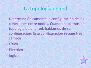 El documento describe diferentes tipos de topologías de red, incluyendo topologías físicas, eléctricas y lógicas. Discute topologías centralizadas, descentralizadas y distribuidas, así como topologías específicas como bus, anillo, estrella, árbol, malla y topologías mixtas. Explica las características clave de cada tipo de topología y cómo los nodos se comunican dentro de cada configuración.