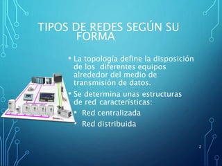 Este documento describe las principales topologías de red según su forma de conexión, incluyendo anillo, estrella, bus, árbol y red. Cada topología tiene ventajas y desventajas específicas en términos de requerimientos de cable, modo de transmisión, diagnóstico de fallos, ampliación y velocidad. Las topologías más comunes en aplicaciones industriales son el bus y el anillo debido a su robustez, velocidad y facilidad de expansión.