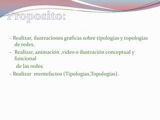 Este documento describe diferentes tipos de topologías y tipologías de redes, incluyendo bus, anillo, estrella, árbol y trama. Explica que la topología se refiere a la forma lógica en que se conectan los nodos de una red, mientras que la tipología se refiere a los tipos de redes como LAN, WAN. El autor analiza cada tipo de topología y provee ejemplos de su uso. El propósito es ilustrar conceptual y funcionalmente cómo funcionan diferentes configuraciones de redes.
