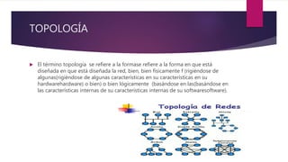 Este documento describe varias topologías de red, incluyendo bus, anillo, estrella, malla, árbol y doble anillo. Explica que la topología se refiere a la forma en que está diseñada física o lógicamente la red. Por ejemplo, una topología de bus usa un único cable al que todos los hosts se conectan, mientras que una topología en estrella conecta todos los hosts a un nodo central. También habla de topologías mixtas y totalmente conexas.
