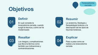 El documento resume la técnica de toracostomía cerrada. Explica que consiste en la colocación de un tubo entre las costillas para drenar el espacio pleural. Revisa brevemente la historia de la técnica y su evolución. Luego describe la anatomía torácica relevante, las indicaciones y contraindicaciones de la toracostomía cerrada, y el equipo y los pasos requeridos para realizarla de manera segura.