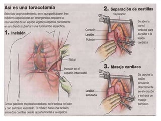 Este documento describe la toracotomía para reanimación como un procedimiento quirúrgico para pacientes con lesiones penetrantes en el tórax que llegan sin pulso pero con actividad eléctrica miocárdica. Señala que un cirujano calificado debe estar presente para determinar si un paciente es candidato para este procedimiento y continuar con la intubación endotraqueal y ventilación mecánica para restituir la circulación. Finalmente, indica que la toracotomía para reanimación raramente es efectiva para pacientes con trauma cerrado que