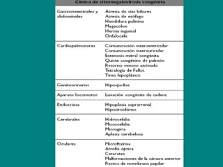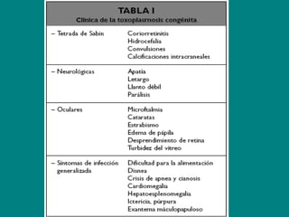 El documento describe las manifestaciones clínicas, agentes etiológicos y metodología de estudio del complejo TORCH, que reúne infecciones congénitas como toxoplasmosis, otros agentes (CMV, herpes, varicela), rubeola, citomegalovirus y hepatitis. Se detalla cómo evaluar a la madre, controlar los estudios del embarazo, organizar los posibles diagnósticos e identificar los exámenes más útiles para estudiar al recién nacido con sospecha de infección congénita.